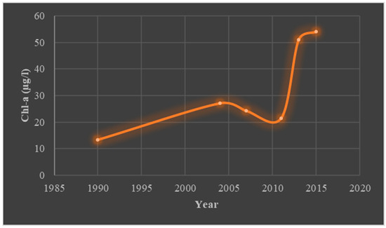 Green algae, blue–green algae, diatoms, and dinoflagellates make up the four major groups of algae in the Chilika Lagoon. The northern–central sections were overrun with green and blue–green algae, while the outer channel was dominated by diatoms. The most important component of the coastal lagoon is chl-a. Chl-a encourages the growth of phytoplankton and is a reliable indicator of the presence of algae in the marine ecosystem. Chl-a typically fluctuated in the Chilika between 0.13 and 51.10 gL−1 (Figure 5). In 2001, the artificial-sea-mouth opening resulted in a high concentration of 54.04 gL−1 [25,62]. The availability of macronutrients, variability of salinity, dissolved oxygen (DO), water-column transparency, suspended matter, river discharge, and seawater influx all have a significant impact on the concentration of chlorophyll-a in the lagoon [63]. Following Phailin, through wind-mediated churning, a sharp increase in chlorophyll content was noticed due to the contribution of benthic chlorophyll [45]. An increase in nutrients carried by the runoff encouraged phytoplankton development. In general, nitrogenous nutrients regulated phytoplankton development. Tropical cyclones increase the amount of nutrients in the water column, which is likely to encourage the growth of phytoplankton. However, simultaneous high-suspended-sediment intake through mixing and runoff results in less light reaching the lagoon, which slows the growth of phytoplankton [63]. Higher suspended particles block light from entering, changing the photosynthetic process. Algal blooms cause DO levels to drop. The concentration of chl-a will increase as the bloom gets larger. Lagoon waters become murky due to the bloom, which reduces clarity and light penetration. Another important factor that controls the growth and distribution of phytoplankton is salinity. Some lagoon areas showed a direct correlation between chl-a and DO while displaying an antagonistic correlation with salinity, turbidity, and depth. This shows that the shallow lagoon sections encouraged photosynthesis at an appropriate light intensity, producing oxygen [64,65]. The seasonal distribution of chl-a in the lagoon is significantly influenced by the interaction between the sea and the river, which has an impact on the physicochemical cycles [63].