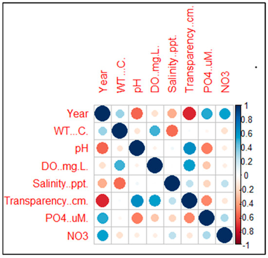 The impacts of various drivers associated with water quality on fisheries are listed in Table 2, which explores why water-quality deterioration is a clear threat to the livelihoods of SSFs. Varying species of fish have evolved to different circumstances of water quality, making them crucial components of aquatic ecosystems and indicators of water quality. Fish are extremely sensitive to a wide range of water-quality factors, such as pH, turbidity, temperature, and dissolved-oxygen concentrations. They are also a member of the food chain. The correlation of water-quality parameters in the Chilika Lagoon from 1950 to 2015 is indicated in Figure 6. The deterioration of the lagoon water environment and the services it offers is a major contributor to the fall in fish productivity. Addressing the root causes of the depletion emphasises the necessity of comprehensive SSF management measures. Integrating multiple environmental effects and repercussions of vulnerabilities in SSF communities is a key goal of the study.