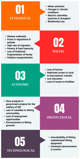 Inherent issues in the socioeconomic conditions and political environments in fisheries, as well as natural and anthropogenic impacts, increase SSF vulnerability and restrict their ability to sustain viable livelihoods [69]. Figure 7 shows the major domain categories in the Chilika’s vulnerability into five groups: ecological, social, economic, institutional, and technical.