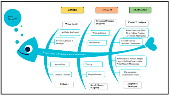 Understanding fishing communities’ existing circumstances and pinpointing their needs is essential to determining what makes SSF communities vulnerable, crafting workable legislative solutions to address that vulnerability, and discovering chances to increase viability [66]. It is believed that vulnerability is a multifaceted, complicated, extremely dynamic, and relative term whose research is highly inter- and transdisciplinary [67]. Someone or something (e.g., small-scale fisheries are more vulnerable than large-scale fisheries) may be considered vulnerable [6,67]. SSFs are at risk because of a wide range of complex environmental, economic, and political stressors and changes [68]. SSF communities are particularly sensitive to local and global change processes because of their heavy reliance on natural resources and close linkages to the coastal environment [2]. The vulnerabilities that fishing communities in the Chilika Lagoon confront are outlined in Figure 7, which links the causes and effects on the water quality.