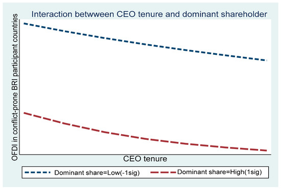 In models 3 and 4, interaction variables were introduced to test Hypothesis 2 and Hypothesis 3, respectively, which posit moderating effects of dominant shareholder and CEO duality, respectively. Model 3 specifically focused on the moderating effect of the dominant shareholder, which was found to have a negative and statistically significant impact on the relationship (β = −0.3814, p < 0.01). To provide a more detailed illustration of this moderating effect, Figure 1 exhibits the relative investment likelihood in conflict-affected BRI participant countries for MNEs with varying levels of dominant shareholder ownership. Notably, Figure 1 demonstrates that when combined with a dominant shareholder, the inclination of long-tenured CEOs to avoid risky investments is likely to be heightened, thereby providing empirical support for Hypothesis 2.