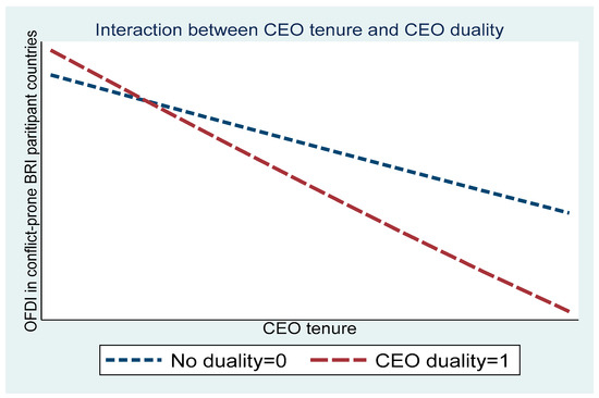 Regarding Hypothesis 3, the analysis conducted in model 4 revealed a significant and negative moderating effect of CEO duality on the relationship between CEO tenure and investment likelihood (β = −0.3977, p < 0.1). This finding indicates that when CEO duality is present, it further diminishes the likelihood of investment in conflict-affected BRI participant countries by Chinese MNEs. The confirmation of this hypothesis is visually depicted in Figure 2, which illustrates the decreasing investment likelihood as a result of the combined influence of CEO duality and CEO tenure. Furthermore, when considering the full model, which includes both interaction terms, consistent results were obtained, providing robust evidence that supports all three hypothesized relationships.