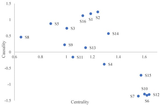 Based on the 16 influencing factors of Integrated Power and Gas System (IPGS) coupling, the direct influence relationships among the influencing factors were determined based on the evaluation results of expert scholars. Based on the established direct influence matrix, calculations were performed according to steps 3, 4, and 5 to obtain the degree of influence, influenced, centrality, and causality of each factor (Figure 1).