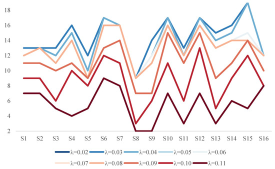 The overall impact matrix H was established according to step 6, and a suitable λ was set to streamline the relationship between factors with a small degree of influence, thus ensuring a moderate degree of factor nodes. The traditional method for setting λ is mainly based on empirical multiple values to obtain satisfactory results (Figure 2). With the help of Figure 2, it can be found that the factor hierarchy is favored at λ = 0.08.
