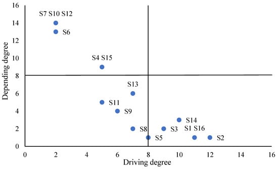 As can be seen from Figure 4, resource endowment (S2), energy structure (S3), strategy planning (S14), and environmental awareness (S16) are located in the fourth quadrant and belong to a more driven, less dependent set of independent factors, which are less influenced by but more influential on other factors, and are the deep core factors driving IPGS coupling.