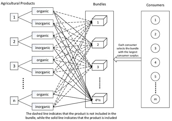 From the perspective of agricultural e-retailers, this paper establishes a nonlinear mixed Integer programming model for interactive bundle pricing strategy (IBPS) of organic and inorganic agricultural products with the goal of maximizing the profit of agricultural e-retailers and optimizing consumer surplus. Simultaneously, we consider the free shipping strategy and consumer organic preferences. The key point of the model is how agricultural product e-commerce platforms price packages to maximize profits under the optimal decision of consumer surplus. The core issue is the optimal price corresponding to each bundle combination. Consumers maximize their surplus based on the difference between the total retained price of the items in the package and their payment price, while agricultural e-commerce platforms maximize their total profit through pricing and free shipping. The specific bundled pricing process is shown in Figure 1.