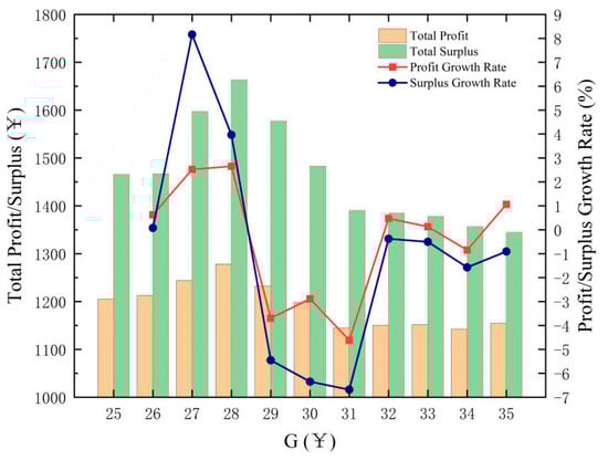 On the one hand, the free shipping strategy reduces the profit per order, which is called the profit shrinkage effect; on the other hand, it can increase the consumer surplus and thus attract more consumers or make them buy more agricultural products, which is called the market expansion effect [26]. The profit shrinkage effect and the market expansion effect jointly affect the profit of the agricultural e-commerce platform, and the profit of the retailer will decrease when the profit shrinkage effect is better than the market expansion effect, and the profit of the retailer will increase when the market expansion effect is better than the profit shrinkage effect. In this section, based on the heuristic algorithm and arithmetic parameters proposed in the previous section, the impact of free shipping threshold on bundle pricing strategy is discussed to find the optimal free shipping threshold. Figure 3 shows the trend of total profit and total consumer surplus as the free shipping threshold changes between 25 and 35.