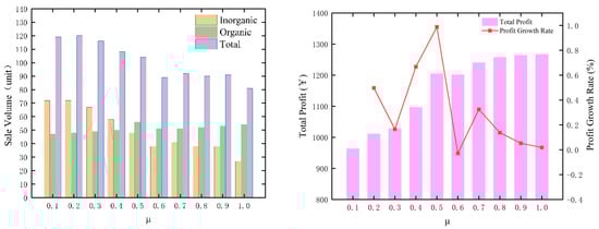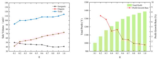 Organic preference refers to the extent to which consumers are willing to pay a higher purchase price for organic agricultural products. To explore the effect of consumers’ organic preference on the bundle pricing strategy of agricultural products, this section analyzes the changes in the quantity of agricultural products sold and the total profit under the optimal pricing strategy when varies in the range of 0–1. Based on this, we propose reasonable management countermeasures and suggestions for agricultural products e-commerce. The trends of the sales volume and total profit of agricultural products with consumer’ organic preference are shown in Figure 4.