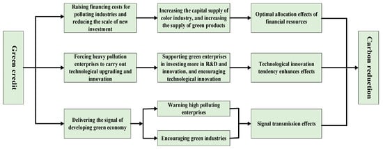 A large number of studies have studied the nexus of financial development and carbon emissions. Scholars have argued that the nexus of financial development and carbon emissions is linear negative [,,], linear positive [,,], and the inverted U shape [,,]. With the development of green finance, some scholars have focused on the nexus of green credit and carbon emissions. They believe that green credit policies force high-pollution industries to carry out technological transformation and product upgrading []. Meanwhile, the implementation of green credit will provide more funding for R&D and innovation in green industries and improve R&D capacity []. In addition, the green credit policy transmits the national development of a green economy signal to the market, which will not only serve as a warning to high-pollution industries, but also attract more private capital (such as venture capital) to the green industry and increase the supply of green capital []. As a result, green credit can affect carbon emissions by optimizing financial resource allocation, improving technological innovation tendency, and passing signals (see Figure 1).