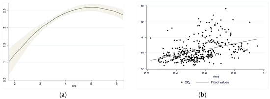 The nonlinear estimation results of model (3) show that the lag term coefficient of carbon emissions is positive and significant at the 1% level, implying that carbon emissions have path-dependent effects. To be specific, the current 0.531 increase in carbon emissions is linked to 1 rise in carbon emissions in the previous period by keeping other things constant. The nonlinear estimation results of model (3) also show that the coefficient of the first-order term of green credit is positive and significant at the 1% level, while the coefficient of the secondary-order term is negative, indicating that the nexus of green credit and carbon emissions is with an inverted U-shaped curve relationship. When green credit is at a low level, it leads to carbon emission increase. It also implies that China’s current green credit mechanism is imperfect. Owing to the lack of risk control ability, effective green credit mechanisms, and the professional ability of green credit in commercial banks, it fails to provide effective financing support for green development projects, namely, the existing phenomenon of bleaching green. Furthermore, green credit expands economies of scale, which in turn increases carbon emissions. The theory is similar to Sadorsky [], assuming that green credit is a means of financial development that makes consumers more easily obtain loans to buy large appliances, such as refrigerators and washing machines. Hence, the use of these appliances contributes to carbon emission increase.