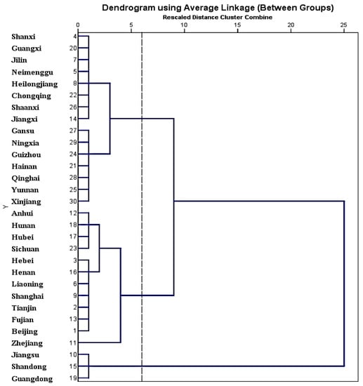 The results of cluster analysis are shown in Figure 5. We sorted the 30 provinces and cities into three types. To be specific, Jiangsu, Shandong, and Guangdong belong to the first category, which is strong industry transfer-out zone (STR); Beijing, Tianjin, Hebei, Liaoning, Shanghai, Zhejiang, Anhui, Fujian, Henan, Hubei, Hunan, and Sichuan belong to the second class, which is weak industry transfer-out zone (WTR). The remaining 15 provinces and cities fall into the third category, which is industrial transfer-in area (TIR).