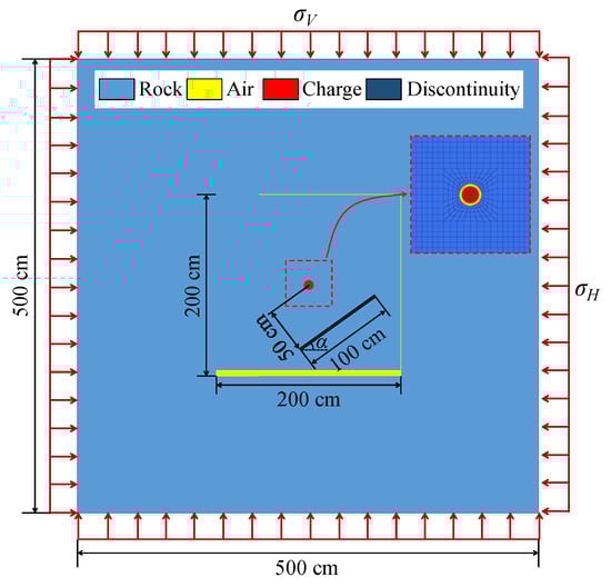 In this study, a single-hole numerical model was established in LS-DYNA to investigate the blasting damage and dynamic response of rock with discontinuity under confining stress, as shown in Figure 1. This model is a square with a length of 5 m, in which a discontinuous surface is prefabricated. In accordance with the specifications of the drilling equipment commonly used in tunneling, the borehole with a diameter of 42 mm is located in the center of the model. Decoupled charges were used, with a cartridge diameter of 32 mm. The discontinuity with a length of 1 m is set 0.5 m away from the center of the borehole. The inclination angle α of the discontinuity is defined as the angle between the discontinuity and the horizontal direction, including five inclination cases (i.e., 0°, 30°, 45°, 60° and 90°) in this paper. To simulate the infinite rock around the borehole in deep engineering, non-reflective boundaries are placed on the surrounding surfaces (i.e., the left, right, upper, and lower surfaces) of the model. A large number of published studies have shown that a non-reflective boundary can greatly reduce the reflection of stress waves at the boundary [33,34,35]. As the numerical results are strongly influenced by the mesh size, the mesh size is strictly necessary for the numerical calculation of the blasting process. To improve the validity of numerical results, it is usually recommended that the mesh size does not exceed 1/6–1/12 of the wavelength; the mesh size should be shorter than 23 mm by calculation [33]. Then, the convergence test is carried out by halving the element size until the difference in numerical results is lower than 5%. Finally, the mesh size of the explosive and rock around the borehole is approximately 2.5 mm, and the mesh size at the boundary of the rock is also determined to be 10 mm to improve the accuracy of numerical calculation. The number of elements and nodes are 284,428 and 571,636, respectively. Moreover, the Arbitrary–Lagrange–Euler (ALE) coupling algorithm is used to avoid mesh distortion. It is generally believed that the coupling area radius must be bigger than ten times the explosive radius to ensure the convergence of numerical calculation results [36]. For this, the air size is determined to be 2 m × 2 m.