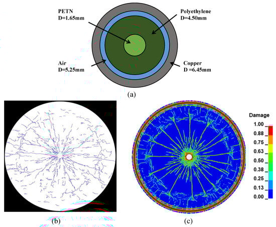 In this paper, the RHT model is used to simulate Banadaki’s experiment [40], which verifies the accuracy of the rock material parameters. Banadaki prepared a series of cylindrical granite samples with a diameter of 144 mm and a height of 150 mm. A blasthole with a diameter of 6.45 mm was drilled in the center of the specimen. The sample is composed of five materials from the inside to the outside: PETN explosive, polyethylene, air, copper, and granite, as shown in Figure 2a. The results of the laboratory single-hole blasting test are shown in Figure 2b. A planar numerical model with the same size as the experiment was established and the numerical simulation results were compared with the physical experiment phenomena to verify the RHT model parameters. The simulation results of single-hole blasting based on the RHT model are shown in Figure 2c. It can be seen from Figure 2 that the damage area shown by the numerical simulation is similar to the results of the test carried out by Banadaki. Simultaneously, the simulation showed that the number of explosion cracks was basically the same as the test result. Therefore, the blasting damage simulation results are in good agreement with the test results, and the model can simulate crack growth more accurately.