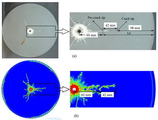 Due to the damage mechanism of discontinuous rock being different from that of continuous rock, the reliability of the RHT model for blast-induced damage simulation of discontinuous rock is verified by the test of Li et al. [41]. The test was performed on a PMMA circular plate with a diameter of 400 mm and a thickness of 10 mm. An empty hole with a diameter of 5 mm is arranged in the center of the circular plate. Three pre-discontinuities are evenly distributed on the circular plate, with an angle of 120° between adjacent pre-discontinuities. The pre-discontinuity length is 30 mm, the width is 0.2 mm, and the discontinuity tip is 30 mm away from the center of the empty hole. The basic parameters of PMMA are derived from Li et al. [41] and Jeong et al. [42], and the RHT parameters are obtained through the empirical formulas [16] and the literature references [15]. Hexogen with a charge diameter of 7 mm is used for initiation, the parameters are derived from Li et al. [41]. Figure 3a,b show the distribution of blast-induced damage cracks obtained by test result and numerical calculation result, respectively. Obviously, there is a good correlation between the test and the numerical calculation result. Therefore, the RHT model can be used to simulate the blast-induced damage distribution of rock with continuity and discontinuity.
