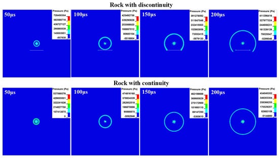 Based on the verified numerical model, the dynamic response and damage evolution process between rock with discontinuity and continuity is compared under 30 MPa hydrostatic stress. In an effort to highlight the influence of confining stress on the damage distribution of discontinuous rock, the angle of discontinuous rock is determined to be 0°. Figure 4 provides the pressure propagation after blasting in rock with discontinuity and continuity under 30 MPa hydrostatic stress. A pressure wave with high strength was formed around the borehole at the initial phase of the cartridge explosion (at 50 μs). In discontinuous rock, the pressure wave propagates away from the borehole and reaches the discontinuity at 100 μs. Along with this, stress concentration is found at both ends of the discontinuity. Subsequently, the pressure wave underwent complex changes in the discontinuity, including the reflection of the wave and so on. In continuous rock, the pressure wave propagates outward and decays. It can be concluded that the pressure wave propagation in rock with discontinuity and continuity is very different.
