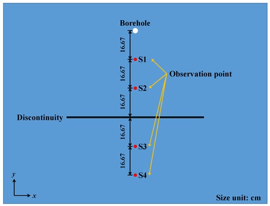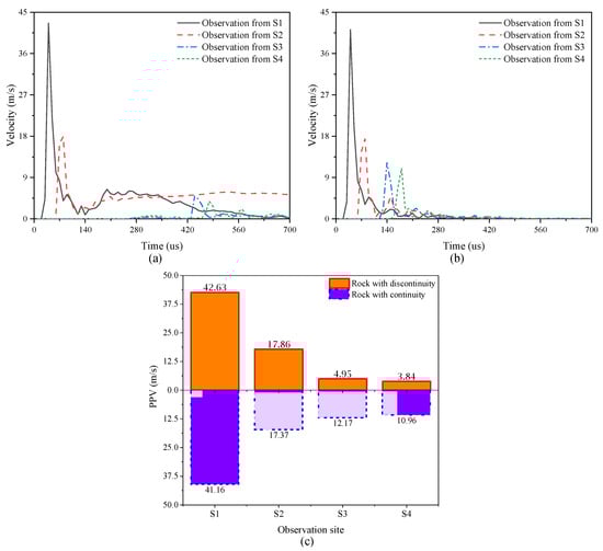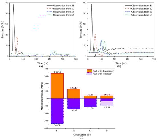 In order to quantitatively compare the dynamic response between rock with discontinuity and continuity, two observation points were respectively placed between the borehole and the discontinuity and directly below the discontinuity, as shown in Figure 5. Two observation points, called S1 and S2, in turn, were used to evenly divide the distance between the borehole and the discontinuity. Two observation points with the same distance, named S3 and S4, are arranged below the discontinuity. The pressure and velocity-time curves at observation points of rock with discontinuity and continuity under 30 MPa hydrostatic stress are shown in Figure 6 and Figure 7. As can be seen from Figure 6a and Figure 7a, the pressure and velocity-time curves at points S1 and S2 (between the borehole and the discontinuity) show different characteristics compared with points S3 and S4 (below the discontinuity). The discontinuities hinder most of the pressure wave, resulting in a significant decrease in the pressure and vibration in the rock directly below the discontinuity. With the attenuation of the stress wave in continuous rock, the peak values of the pressure and velocity curve decrease gradually (as seen in Figure 6b and Figure 7b). Figure 6c and Figure 7c compare the maximum pressure and peak particle velocity (PPV) at the four observation points. The maximum pressure and PPV of rock with discontinuity and continuity are similar from the observation points S1 and S2 (between the borehole and the discontinuity). However, the maximum pressure and PPV of the discontinuous rock are significantly smaller than that of the continuous rock from the observation points S3 and S4 (below the discontinuity). This is because the reflection of the stress wave and the deformation of the discontinuous medium occurs at the discontinuity when the stress wave passes through the discontinuity. More energy carried by stress waves cannot enter the rock below the discontinuity. Based on this principle, pre-splitting blasting is widely used in rock engineering projects to reduce blasting vibration and maintain the stability of the remaining rock mass [43]. For instance, a series of blasting tests with and without the pre-splitting technique were carried out at the Rampura Agucha mine by P.K. Singh et al. [44]. The results showed that blast-induced vibrations were significantly reduced in the pre-splitting blasting tests as compared to the tests without the pre-splitting blasting technique. Zhou et al. [45] compared the differences in ground vibrations induced by the blasting excavations of shafts with the pre-splitting and smooth techniques. The results showed that at the same monitoring locations and directions, the peak particle velocities in the case with the pre-splitting blasting technique were significantly lower than those in the case with the smooth blasting technique.