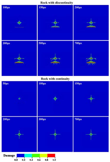 Figure 8 shows the damage evolution process of rock with discontinuity and continuity under hydrostatic stress of 30 MPa. Damage distributions at several typical moments (i.e., 50 μs, 100 μs, 150 μs, 200 μs, 300 μs, 500 μs, and 700 μs) are given. As can be seen from Figure 8, regardless of the discontinuity of the rock, the damage induced by blasting presents isotropy under hydrostatic stress (at 100 μs). Figure 8 shows that the damage cracks are dense and distributed in the vicinity of the borehole (i.e., the crushed zone), and there are fewer explosion cracks distribution in the far area (i.e., the cracked zone). In the crushed zone, the rock is crushed because the shock wave generated by the explosion is stronger than the dynamic compressive strength of the rock. When moving away from the borehole, the strength of the shock wave decreases. Until its strength is lower than the dynamic compressive strength of the rock, the rock escapes being crushed. However, the tensile strength of the rock is much lower, resulting in a cracked zone appearing due to the stress wave [15]. When a discontinuity appears below the borehole, the damage distribution of rock around the borehole shows a significant change. It seems that the discontinuity causes more damage in the rock mass between the borehole and the discontinuity after blasting. A damaged area with a triangular shape developed above the discontinuity (on the side close to the borehole). It is because the stretch wave reflected at the discontinuity forms denser damage of rock near the discontinuity. In addition, some damage cracks appear below the discontinuity through the discontinuity (after 300 μs). The reason may be that the discontinuity is gradually closed under the blasting pressure, resulting in more energy generated by the explosion into the rock mass below the discontinuity. It can be seen that the existence of discontinuities changes the damage distribution around boreholes under the 30 MPa hydrostatic stress. Therefore, under the combined action of confining stress and discontinuity, rock damage characteristics are more complex than those of rock with continuity.