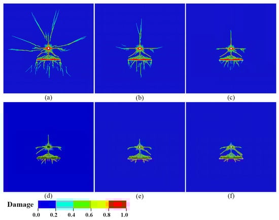 In an effort to study the damage characteristics of the rock with discontinuity under different hydrostatic stresses, six cases of hydrostatic stresses are designed, i.e., 0 MPa, 10 MPa, 20 MPa, 30 MPa, 40 MPa and 50 MPa. Figure 9 shows rock damage under these six cases of hydrostatic stresses. As the hydrostatic stress changes, the distribution of damage also shows a difference. It can be seen from Figure 9 that the damage between the borehole and the discontinuity is almost triangular in shape. However, with the increase in hydrostatic stress, the damage around the borehole decreases gradually in the other three zones (i.e., the damage along the horizontal direction, the damage above the borehole, and the damage behind the discontinuity). Concretely, without confining stress, damage spreads more strongly from the borehole to the model boundary. There are several major damage cracks at the horizontal and above the borehole. It is also observed that many damage cracks are formed on both ends and below the discontinuity. When the hydrostatic stress increases to 10 MPa, the number of damage cracks in the horizontal direction and above the borehole decreases intuitively from the simulation results. In this case, the length of damage cracks at both ends of the discontinuity is obviously inhibited, and the length and number of cracks are lower than those without confining stress. It is noteworthy that at a hydrostatic pressure of 20 MPa, the damage cracks at both ends of the discontinuity almost disappear. An interesting observation was that under 50 MPa hydrostatic stress, almost without damage was observed above the borehole, but there was still damage between the borehole and disconnection. Theoretically, under hydrostatic stress, damage should be distributed almost evenly around the borehole in continuous rock. However, based on such observation under 50 MPa hydrostatic stress, it can be assumed that the discontinuity weakens the barrier caused by the confining stress.