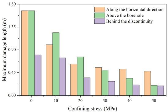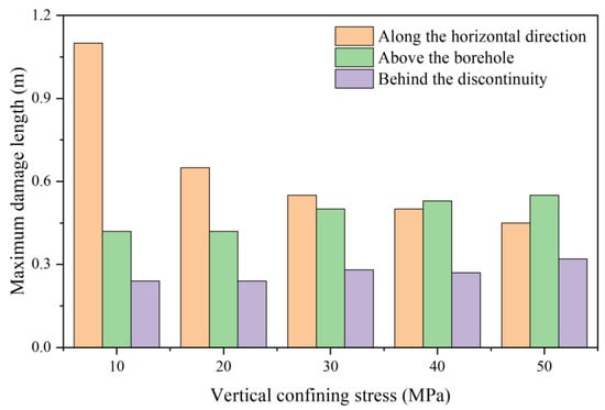 Due to the tectonic stress in the underground deep rock, the in situ stress showed anisotropy in horizontal and vertical directions. Thus, four cases of non-hydrostatic stresses were set. The horizontal confining stress was fixed without change, and the vertical confining stress was determined to be 10 MPa, 20 MPa, 40 MPa, and 50 MPa. The damage of rock with discontinuity was compared between four cases of non-hydrostatic stress and hydrostatic stress, as shown in Figure 12. It can be seen from Figure 12 that, compared with hydrostatic stress, the damage distribution of rock with discontinuity appears to have stronger anisotropy under non-hydrostatic stress. When the vertical stress is lower than or equal to 30 MPa, the length of the damage crack in the horizontal direction increases obviously with the decrease in the vertical stress. When the vertical stress is greater than 30 MPa, the length of the damage crack in the vertical direction has no significant change. Meanwhile, the damage along the vertical direction increases between the borehole and discontinuity with the increase in vertical stress. The damage crack from the borehole is more inclined to connect with the discontinuous ends. As the vertical stress increases, so does the area of damage below the discontinuity. The results show that the damage cracks will preferentially propagate in the direction of high stress.