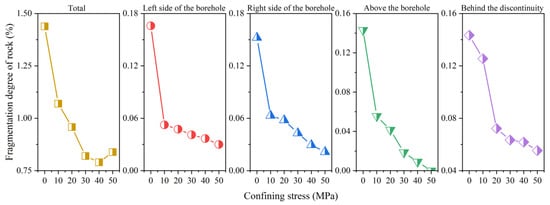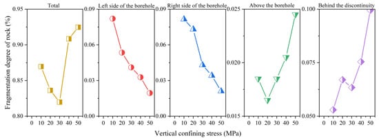 Figure 13 and Figure 14 show the maximum damage length and fragmentation degree in different zones under four cases of non-hydrostatic stress and hydrostatic stress. Figure 13 and Figure 14 show that, as the vertical confining stress increases, the damage length and damage area along the horizontal direction decrease gradually, while the damage length above the borehole shows an increasing trend. In addition, the change rate of damage length in the horizontal direction with vertical stress is greater than that above the borehole. When the vertical stress is lower than 30 MPa (i.e., maximum principal stress along the horizontal direction), the damage length in the horizontal direction increases gradually with the decrease in vertical stress. On the contrary, when the vertical stress is greater than 30 MPa (i.e., maximum principal stress along the vertical direction), the damage length and area of the direction of high stress increase with the increase in vertical stress. The results show that the damage cracks will be inhibited in the direction of low confining stress, and damage cracks are prone to develop towards the direction of high confining stress.
