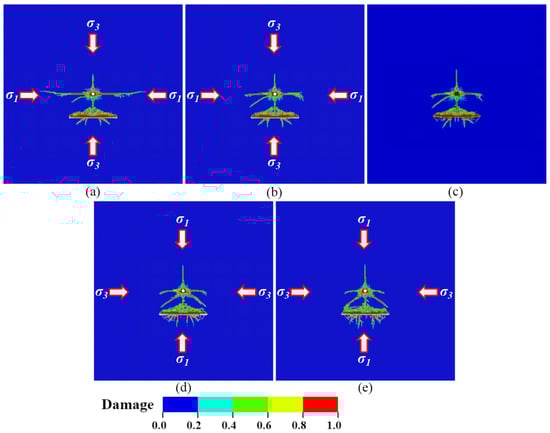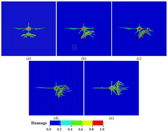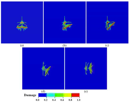 Damage distribution of discontinuous rock with inclination angles of (a) 0°, (b) 30°, (c) 45°, (d) 60°, and (e) 90° under 50 MPa vertical stress and 30 MPa horizontal stress.