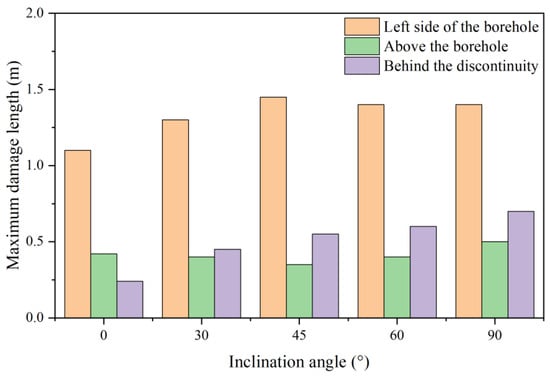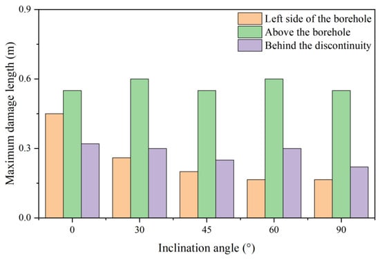 In Section 3.2, the damage distribution of rock with horizontal discontinuity under hydrostatic and non-hydrostatic stresses is analyzed. The difference between horizontal and vertical stress has a serious effect on the damage distribution of rock with horizontal discontinuity under non-hydrostatic stress. In order to further investigate the influence of inclination angle on the damage distribution of discontinuous rocks under non-hydrostatic stress, the discontinuous rock with five cases of inclination angle (i.e., 0°, 30°, 45°, 60°, and 90°) is designed under non-hydrostatic stress. According to the results in Section 3.2, the horizontal stress is fixed at 30 MPa, and the vertical stress is determined at 10 MPa and 50 MPa. Figure 15 gives the damage distribution of discontinuous rocks with different inclination angles under horizontal stress of 30 MPa and vertical stress of 10 MPa. It can be seen that the inclination angles of discontinuity change the damage distribution under the same confining stress. Firstly, the damages along the horizontal direction on the left side of the borehole and the vertical direction above the borehole are less affected by the inclination angles of discontinuity. This is because, on the side away from the discontinuity, the damage distribution is mainly determined by the confining stress and blasting loading. It can be seen more clearly from Figure 16 that the maximum damage length on the left side of the borehole first increases and then decreases as the inclination angle increases. On the contrary, above the borehole, the damage length first decreases and then increases as the inclination angle increases. Then, more differences in the damage distribution were shown in the zone between the borehole and discontinuity and the zone behind discontinuity. Some blasting-induced damage originating from the borehole connects the borehole to the ends of discontinuity, ruling out the case of the angle being 0°. It may be caused by the anisotropy of the confining stress and change in discontinuous inclination. Meanwhile, with the increase in inclination angle, more and longer blasting-induced damage appears behind the discontinuity (as seen in Figure 15 and Figure 17). When the inclination angle of discontinuity is 90°, the number of damage cracks behind the discontinuity is the largest. It may be because when the discontinuity angle changes from 0° to 90°, the horizontal high confining stress could lead to the discontinuity closure more easily so that more blasting energy crosses the discontinuity.
