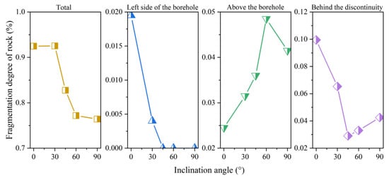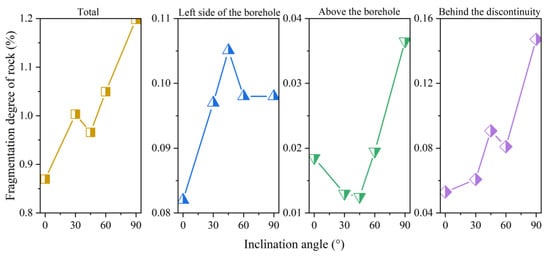 Fragmentation degree in different areas of discontinuous rock with different inclination angles under 10 MPa vertical stress and 30 MPa horizontal stress.