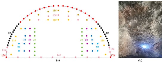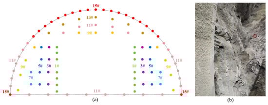 Smooth blasting (original scheme) was used to excavate the upper bench of the tunnel, and the borehole layouts are shown in Figure 22a. It should be noted that 1#, 3#, etc., represent the detonation sequence of the boreholes. A total of 100 boreholes with diameters of 42 mm are set, and the spacing between the peripheral boreholes is 60 cm. An emulsion explosive with a diameter of 32 mm was used. As can be seen from Figure 22b, half-boreholes were not found on the side of the tunnel after blasting. By analyzing the test results, it can be seen that there are three possible reasons, including the tunnel working area passing through the layered formation, the joint within rock mass, and the excessive damage to discontinuity caused by centralized charging of peripheral boreholes.