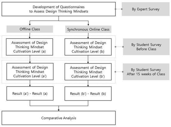 This study started by identifying evaluation questionnaires to gauge design thinking mindsets. Subsequently, the enhancement level of each mindset was assessed in both offline and synchronous online classes through a comprehensive survey of students. The survey was conducted both before and after a 15-week course. The final analysis is presented in the last section. The detailed research process is provided in Figure 1.