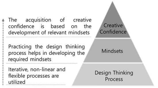 A central objective of design thinking education is to nurture creative confidence []. Creative confidence entails the self-belief to embrace risks, learn from failure, and creatively address challenges to yield innovative solutions. Kelley and Kelley emphasized that design thinking education should foster resilient and optimistic creative confidence []. As shown in Figure 3, Rauth et al. stressed that creative confidence is cultivated by experiencing the design thinking process and developing the required mindsets []. This nurturing of creative mindsets occurs through exposure to processes and the development of behavioral patterns in specific situations. Consequently, these mindsets lead to a preference for creative behavior in uncertain and chaotic situations.
