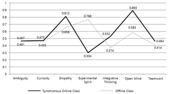 The results of examining design thinking mindsets were analyzed using SPSS 21.0 software. The study compared two teaching methods: offline and synchronous online courses. The research examined cultivation levels of seven mindsets: ambiguity, curiosity, empathy, experimental spirit, integrative thinking, open mind, and teamwork, as dependent variables. These variables were analyzed to assess the impact of different instructional modalities on developing design thinking mindsets. The study utilized a student survey with questions based on a 5-point Likert scale []. In this scale, the ratings were interpreted such that “1” indicated strongly disagree, “2” represented disagree, “3” denoted a neutral, “4” indicated agree, and “5” signified strongly agree.