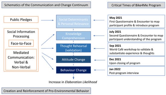 Figure 1 summarizes our approach in integrating the analytical framework with the Bike2Me sustainable mobility pilot program case study. The pilot has several key timings which we considered critical for assessing their level of Elaboration Likelihood and what the schemes of communication behind the scenes were. Together, the analysis will show an evolution of the creation and reinforcement of PEB in this pilot program.