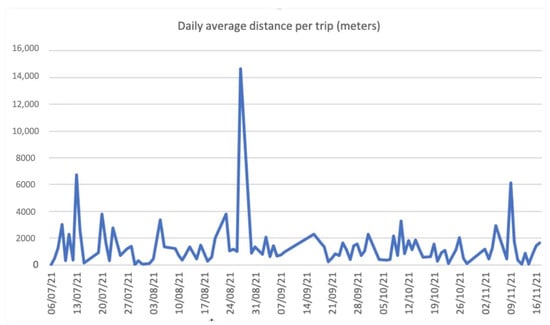 During the week, 43% go to work on foot every day or regularly, whereas 25.8% choose cycling. The pilot developed under COVID-19 lockdowns, but participation was stable though more evident in the second half, with irregular distances (Figure 2).