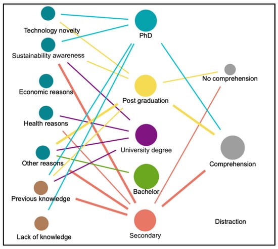 Correlations between personal relevance, level of education, and level of comprehension. Note: the bubbles shown on this graphic indicate the variables and the lines indicate the correlation between two variables. The thickness of the lines shows the frequency of responses where the two variables were present. The size of the bubbles indicates the frequency of responses where the corresponding variable was present. We relate each social determinant (the bubbles on the center) with the motivation and initial cognition variables (the bubbles on the left) and with comprehension outcome (the bubbles on the right). The bubbles are invariably green blue for motivation, brown for initial cognition, and grey for comprehension. Social determinants and corresponding categories are different in each figure, and so are the colors to highlight them. The lines on the left relate social determinants with motivation and initial knowledge. The lines on the right indicate the influence of each social determinant category on the comprehension level.
