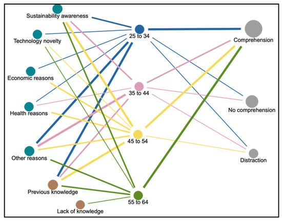 The age difference (Figure 4) did not seem to have much influence on the participants’ level of comprehension. The younger group (25–34) were mostly motivated by technological novelty and sustainability awareness and mostly had some previous knowledge related to sustainable mobility. The middle group (35–44), similarly, were mostly motivated by technological novelty, followed by sustainability awareness and previous knowledge; however, had a mixed result between comprehension, no comprehension, and distraction. The middle-senior group (45–54) was motivated primarily by sustainability awareness and previous knowledge and was mostly able to comprehend the program. The senior group (55–64) performed very similarly to the younger group (25–34). To summarize, younger participants tend to be driven mostly by technological novelty, while older participants tend to be driven mostly by sustainability awareness. But the age differences did not have a major effect on the participants’ level of comprehension.