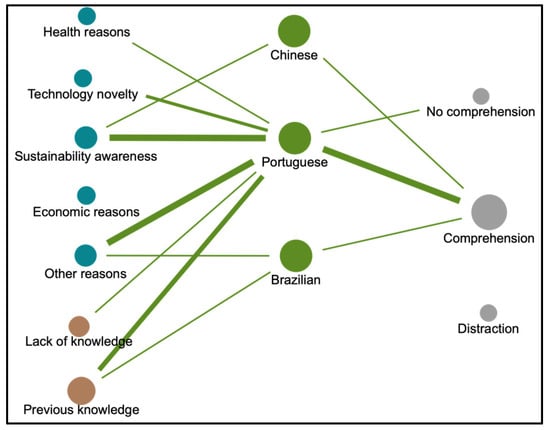 Nationality does not seem to influence the level of comprehension of the participants (Figure 6), since almost all of them were able to comprehend. Portuguese participants expressed more motivation and were more represented in terms of previous knowledge and the level of comprehension, as they represented about 3/4 of the group. Sustainability awareness and other reasons are the main motivations.