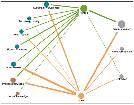 Gender does not seem to have much influence on comprehension level (Figure 9). Both male and female participants had decent previous knowledge and reached a decent level of comprehension; it is hard to say which group had a better comprehension than the other. Both groups were driven primarily by sustainability awareness; however, it is evident that female participants were also driven primarily by economic reasons whilst male participants were also driven primarily by other reasons.