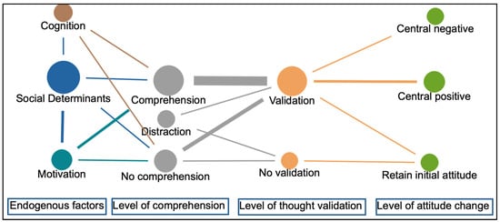 Correlation path between endogenous factors (social determinants, initial cognition, and motivation), level of comprehension, level of thought validation, and level of attitude change, all along the elaboration continuum. Note: the bubbles indicate the variables, and the lines indicate the correlation between two variables. The thickness of the lines shows the frequency of responses where two variables were present. The size of the bubbles indicates the frequency of responses where this variable was present.