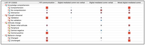 Relationships between the ways of communication and the resultant elaboration status of participants’ pro-environmental behavior. Note: Each square indicates the relationship between two variables. The stronger the relationship between the two, the more the size and color change. Gradually, the size increases and the color changes from blue, to dark grey, to dark red, to red.