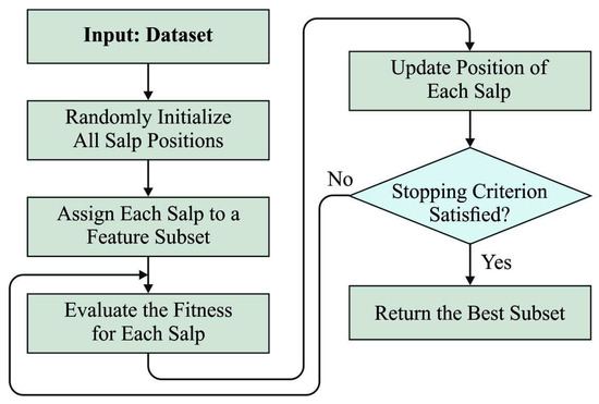 The constants and are in charge of determining fitness. The classifier’s error rate, E(C), is represented by the feature subset |F| of the total features, |T|. Based on the fitness value, FS can be controlled by a single dimension vector in the [0, 1] range. Binary values within this range display 1 for FS and 0 for not FS. It is eliminated using a feature subset from the salp population.