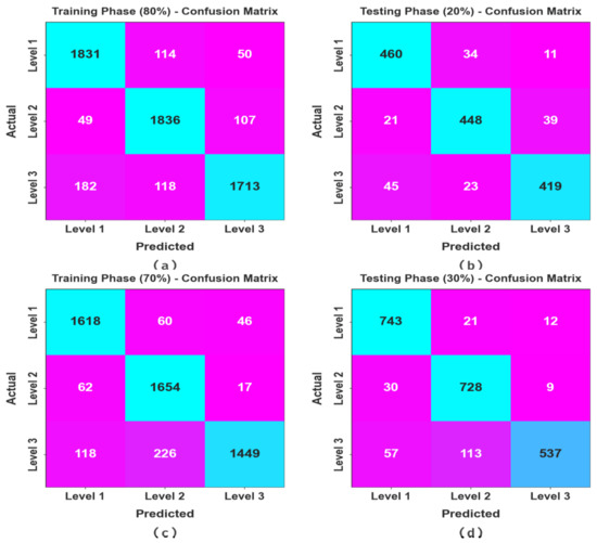 Confusion matrices of (a,b) 80:20 of TR set/TS set and (c,d) 70:30 of TR set/TS set.