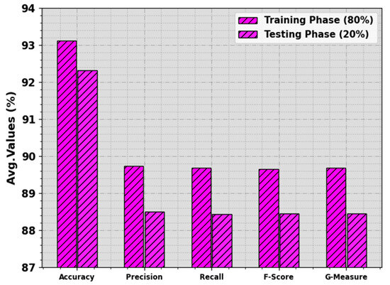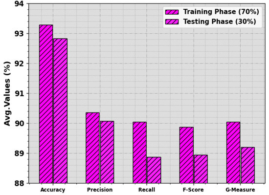 In Table 4 and Figure 7, the climate control outcomes of the ACC-ISSAOEL method under 70:30 of the TR set/TS set. The simulation value demonstrated that the ACC-ISSAOEL algorithm detects three levels proficiently. On 70% of the TR set, the ACC-ISSAOEL technique gains average , , , , and of 93.28%, 90.36%, 90.04%, 89.88%, and 90.04%, respectively. At the same time, on 30% of the TS set, the ACC-ISSAOEL technique gains average , , , , and of 92.83%, 90.07%, 88.87%, 88.94%, and 89.20%, respectively.