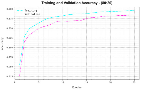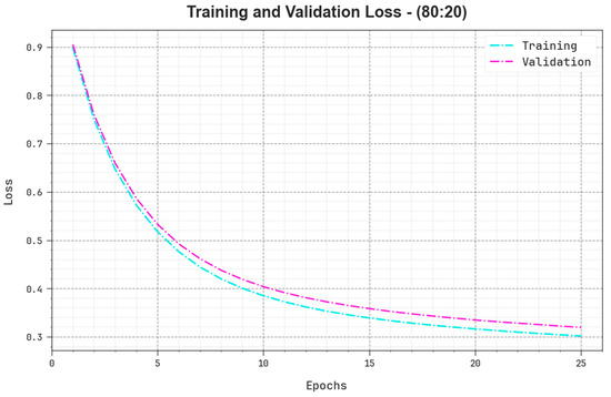 In Figure 6, the and results of the ACC-ISSAOEL method on 80:20 of the TR set/TS set are shown. defines the error among the predictive performance and original values on the TR data. represents the measure of the performance of the ACC-ISSAOEL technique on individual validation data. The outcomes indicate that and tend to reduce with rising epochs. They depict the enhanced performance of the ACC-ISSAOEL method and its capability to generate accurate classification. The reduced value of and demonstrates the enhanced performance of the ACC-ISSAOEL method on capturing patterns and relationships.