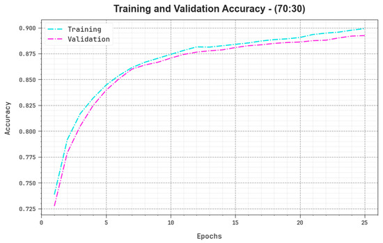 In Figure 8 shows the training accuracy , and of the ACC-ISSAOEL technique on 70:30 of the TR set/TS set. is computed by evaluating the evaluation of the ACC-ISSAOEL technique on the TR dataset whereas is determined by the performance on a separate testing dataset. The outcomes exhibit that and increase with an upsurge in epochs. Thus, the performance of the ACC-ISSAOEL method gets improved on the TR and TS dataset with a rise in the number of epochs.