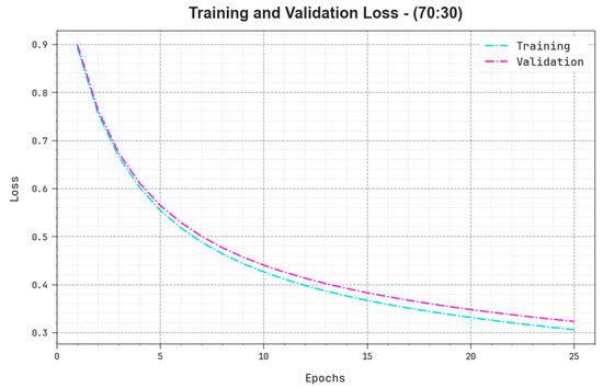 In Figure 9, the and results of the ACC-ISSAOEL technique on 70:30 of the TR set/TS set are shown. defines the error among the predictive performance and original values on the TR data. represents the measure of the performance of the ACC-ISSAOEL technique on individual validation data. The results indicate that and tend to decrease with rising epochs. It describes the improved performance of the ACC-ISSAOEL technique and its capability to generate accurate classification. The reduced value of and demonstrates the enhanced performance of the ACC-ISSAOEL technique in capturing patterns and relationships.