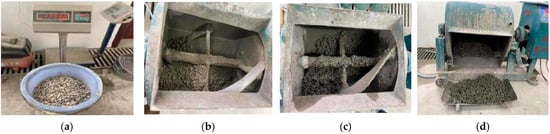 Mixing process of the cement-wrapped paste method: (a) weighing material, (b) cement wrapped paste; (c) mixed material mixing, and (d) discharge.
