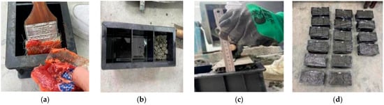 Before discharging the permeable concrete mixture, first, a thin layer of butter was plied on the inside of the mold to ensure the uniformity of the mixture in the compaction process. One third of the stirred mixture was discharged into the mold were repeated, the above steps twice more to make sure the mixture filled the whole mold uniformly, different according to the loose paving, a certain height, were used to determine an appropriate amount of the mixture is placed above the mold. Finally, the mixture was compressed into the mold. The forming process is shown in Figure 2. The maintenance process of the test block refers to Technical Specifications for permeable cement pavement CJJ/T135-2009 []. The dimensions of the dies used in this study are all 100 mm × 100 mm × 100 mm. After the specimen was molded, it was placed in water for maintenance, as shown in Figure 3. The curing water temperature was 25 ± 5 °C. After curing for 28 days, the mechanical properties and water permeability were tested.