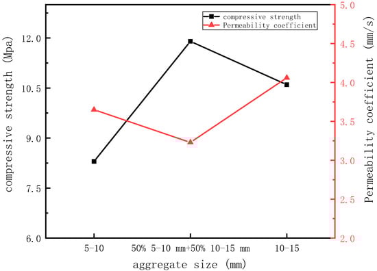 Relationship between aggregate size and compressive strength and permeability coefficient.