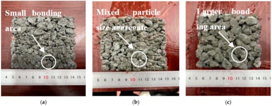 The bonding between different particle sizes is shown in Figure 5. As can be seen, there were more bonding sites between the mixed aggregates than the 10–15 mm size aggregates, and the staggered distribution of the 5–10 mm aggregate and 10–15 mm aggregate ensured the number of bonding sites between aggregates. Because of the increase in contact area between mixed aggregates, the interlocking effect between aggregates was enhanced. Therefore, compared with the single-size aggregate permeable concrete, the bond strength of the mixed-size aggregate permeable concrete specimen was enhanced, and the compressive performance was better, but the mixed water permeability was decreased. This was due to an increase in the number of bonds between the 50% 5–10 mm + 50% 10–15 mm mixed aggregates, with a high interpore and tortuosity, and the permeability was closely related to the zigzag degree of pores, the aggregate with a 10–15 mm particle size formed pores with less zigzag degrees, it makes easier, which made the spatial distribution and shape of the pores more reasonable.