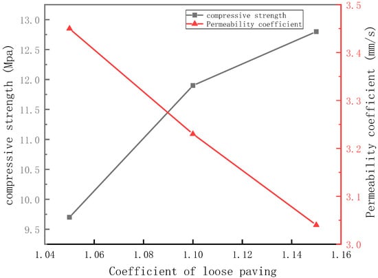 The relationship between the compressive strength, permeability rate, and loose paving coefficient of permeable concrete is shown in Figure 6. When the loose paving coefficient was 1.05, the compressive strength of permeable concrete was 9.7 MPa and the permeability coefficient was 3.45 mm/s. The compressive strength of the specimens with loose paving numbers of 1.10 and 1.15 was 11.9 MPa and 12.8 MPa, respectively, and the permeability coefficient was 3.23 mm/s and 3.04 mm/s, respectively. Compared with the permeable concrete with a loose paving coefficient of 1.05, the compressive strength increased by 22.7% and 31.9 %, respectively, and the permeability coefficient decreased by 6.4% and 11.9%, respectively. The compressive strength was positively correlated with the loose paving coefficient, and the permeability coefficient was negatively correlated with the loose paving coefficient, which close to the first-order function relationship.